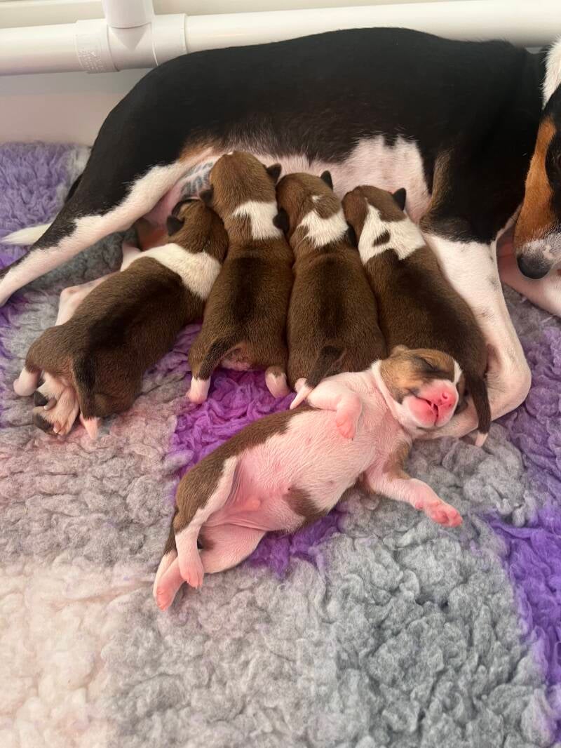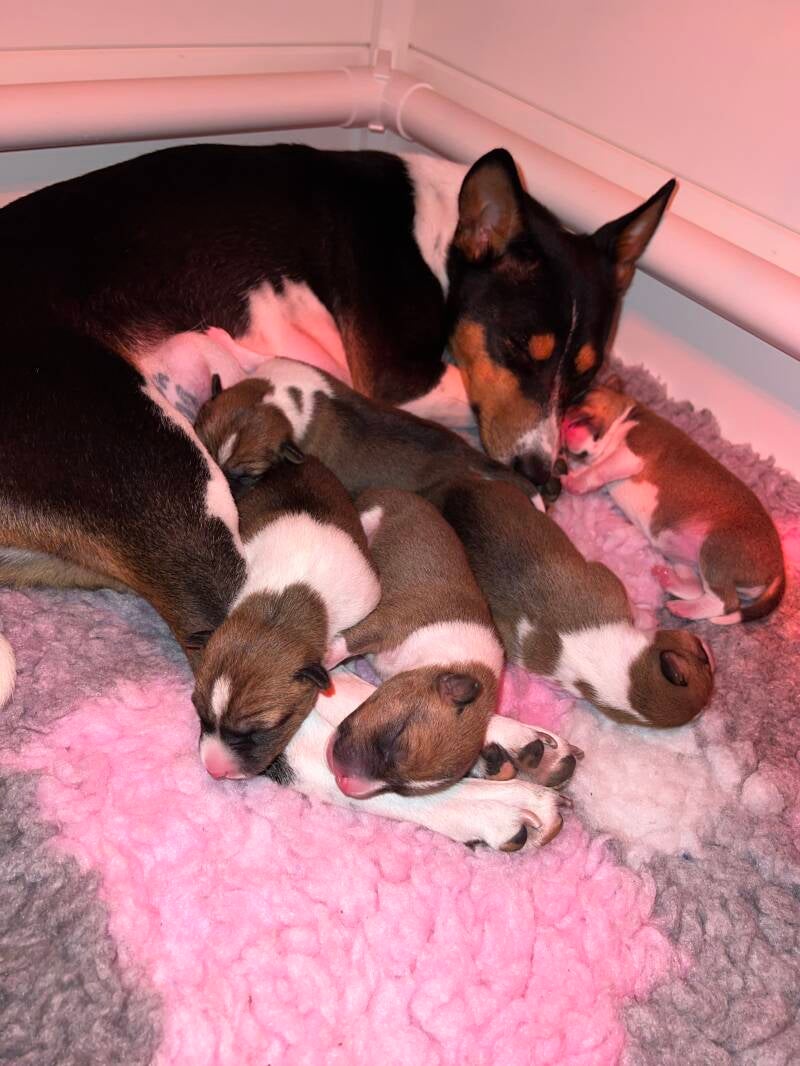 Nika’s buikje groeide zichtbaar en zij droeg haar zwangerschap met zoveel rust en kracht. En toen, op de 62e dag na de dekking, werden wij overweldigd door het grootste wonder: geen drie, geen vier, maar maar liefst vijf prachtige, kerngezonde puppy’s zagen het levenslicht. Twee stoere jongens en drie lieve meisjes, allemaal rood-wit, precies zoals hun trotse vader Robin.